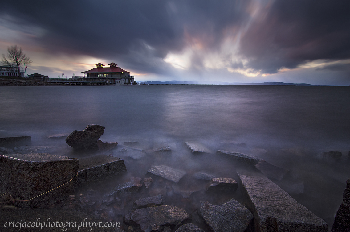 The Boat House at the Burlington Waterfront in Burlington, Vermont. This was shot using a B&W 110 Neutral Density Filter. You can see a snow squall crossing the lake approaching the Boat House.