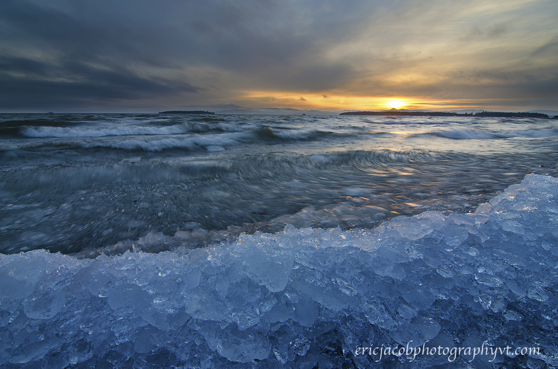 This image was taken at Whites Beach in South Hero Vermont at sunset. It is 2 images, one with the sky exposed properly and one with the foreground exposed properly, hand-blended in CS6. The ice chunks along the shoreline were also trapped in the wave you can see streaking slightly as it rolled in.